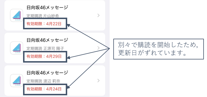 ちなみに,複数メンバーを購読している方は下の画像のように更新日がズレていると思います。