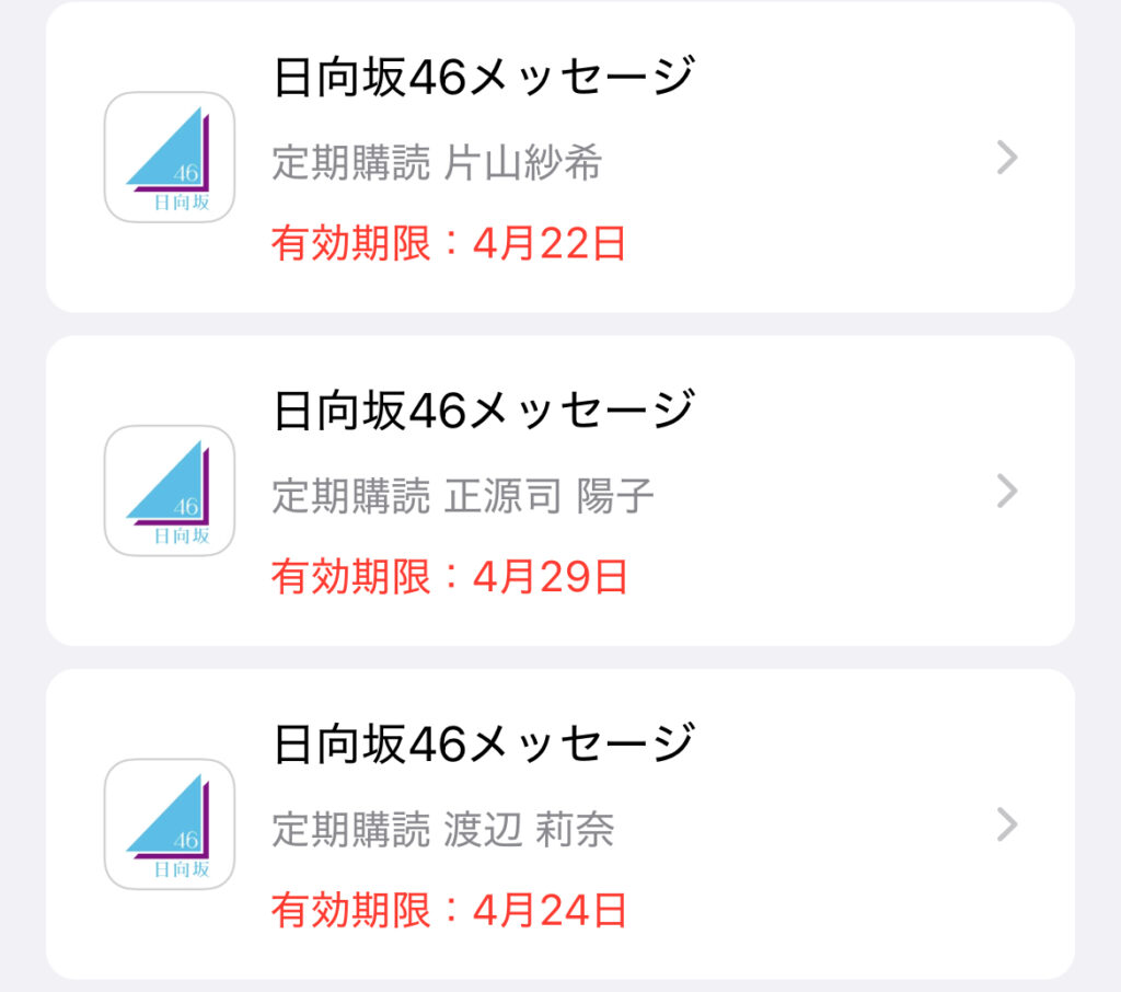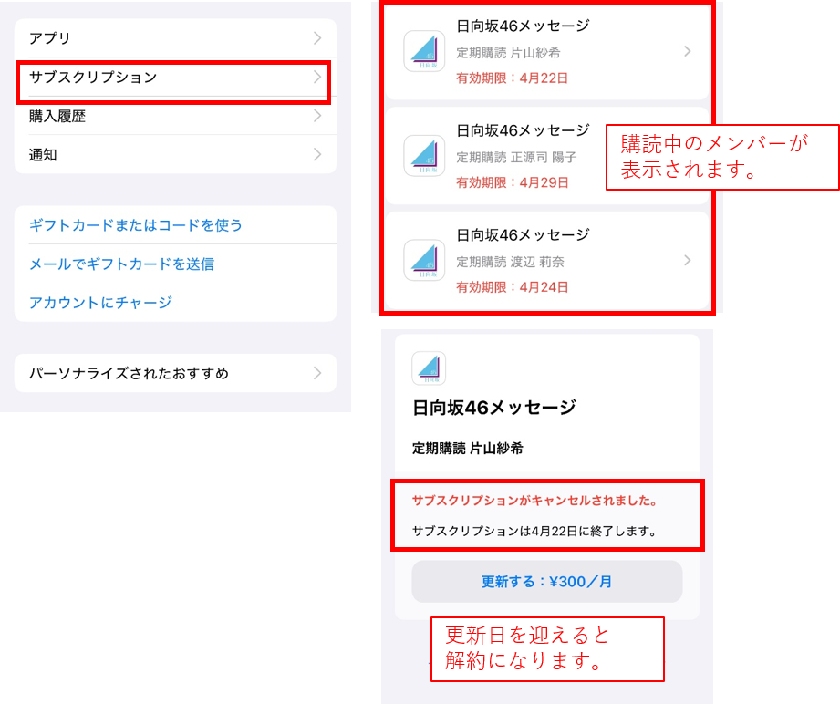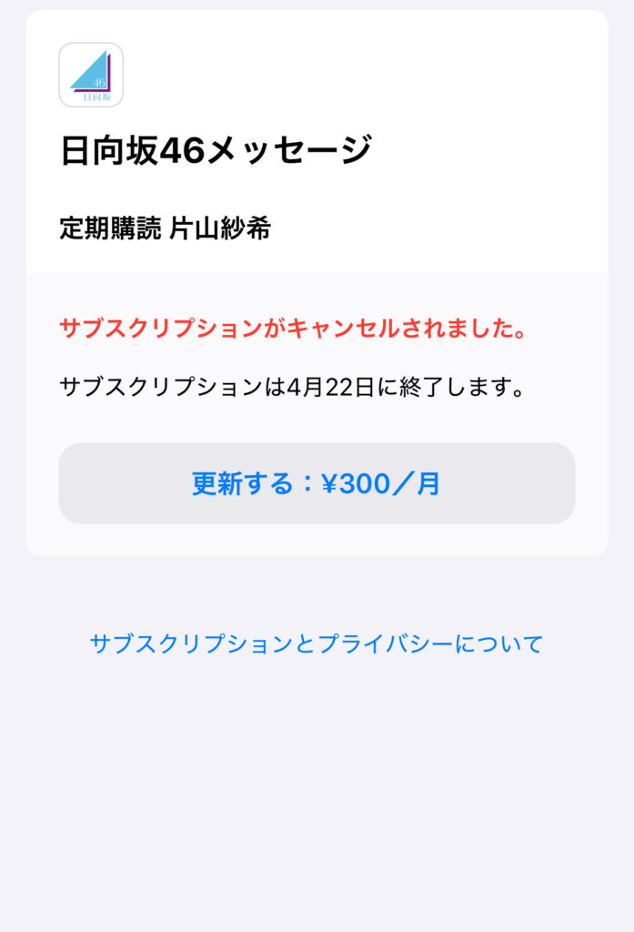 アップルストアのアカウントからサブスクリプション→日向坂46メッセージを選択することで,サブスクリプションをキャンセルできます。この画面になれば完了です。